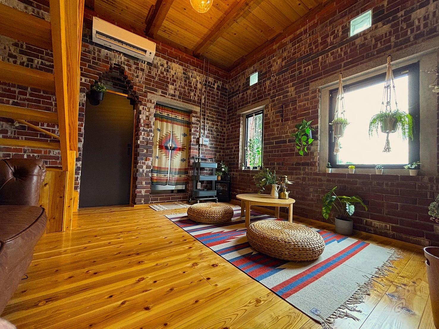 開放的な空間には芝生、心地よい風、そしてレンガ調のあたたかみあるヴィラ。